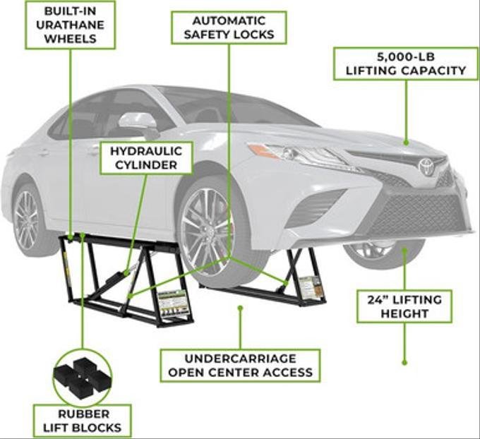 - 5,000 lb capacity, ALI certified portable car lift.