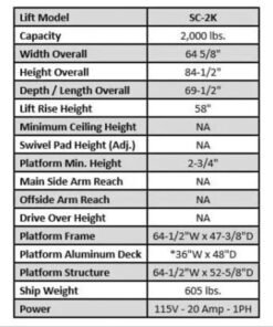 The Tuxedo SC-2K operates on common 115V single-phase power, making it easier to integrate into typical home garages and small workshops. An electric-hydraulic power unit handles the lifting, while the steel column and platform structure provide solid support when correctly installed.